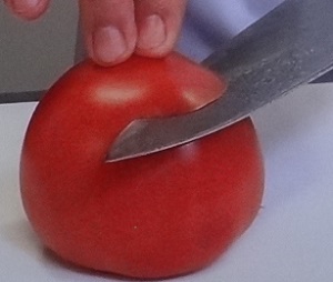 ・トマト横に包丁を入れ、スライスします。