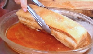 2.①を耐熱ボウルに入れ、しょうゆを加える。