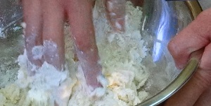2.ぬるま湯を徐々に入れて生地をこねていく。