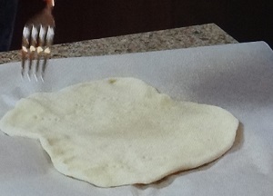 4.発酵は必要なく、クッキングシートを、生地を薄く広げる。