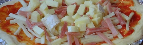 8.ケチャップを塗り、とろけるチーズをのせて、さけるチーズ、プロセスチーズ、キャンディチーズをせ、ハムをちらして、最後にカマンベールチーズを乗せればトッピングの完成。