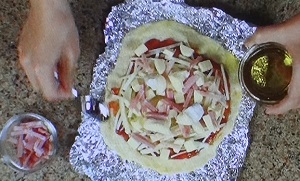 10.耳にオリーブオイルを薄く塗る。ピザの表面にも少しかける。