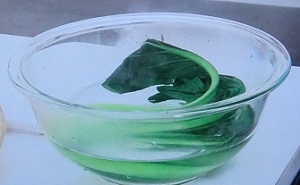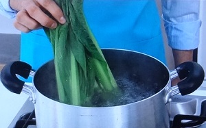 葉の部分を持って、茎の部分を30秒間、先にゆでる