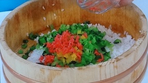 5.酢飯に、切った小松菜・たくあん・紅ショウガ・白ごまを入れて、混ぜる。