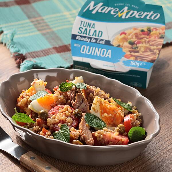 キヌアと野菜のミックスがチャンクタイプのツナと二層になった缶詰。