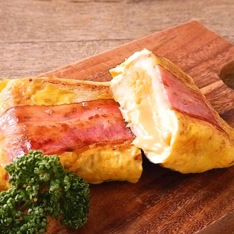 卵牛乳砂糖を混ぜた卵液に具材を挟んだ食パンを両面浸し、バターを溶かしたフライパンで両面こんがり焼いたらできあがり。