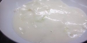 2.ふたを開け、長芋をお玉の裏でとろみが出るまでつぶす。