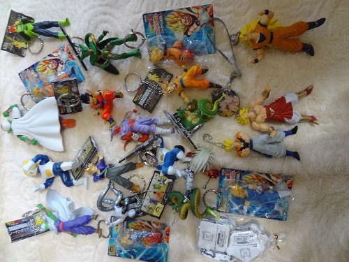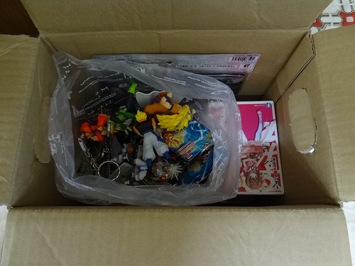 DVDが6本、漫画が8冊、ライトノベルの本100冊ほど、そしてドラゴンボールのキーホルダーなどの景品が30点ほど、あとの残りは全部トレカです。