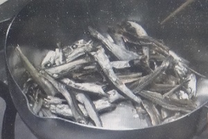 エラ・内臓を取り除いた煮干しを鍋で乾煎りして、
